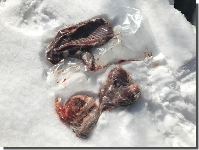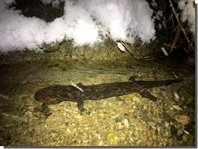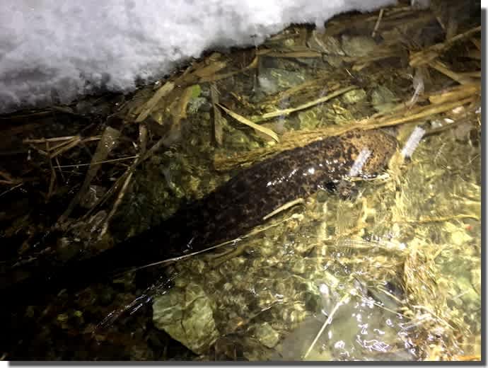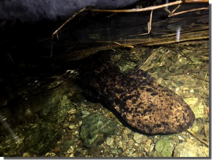 雪で滑り落ちないよう慎重に川岸を覗き込むと、