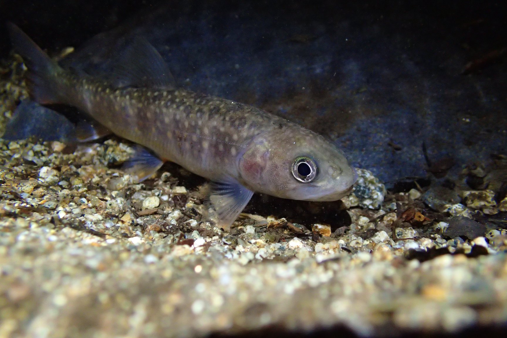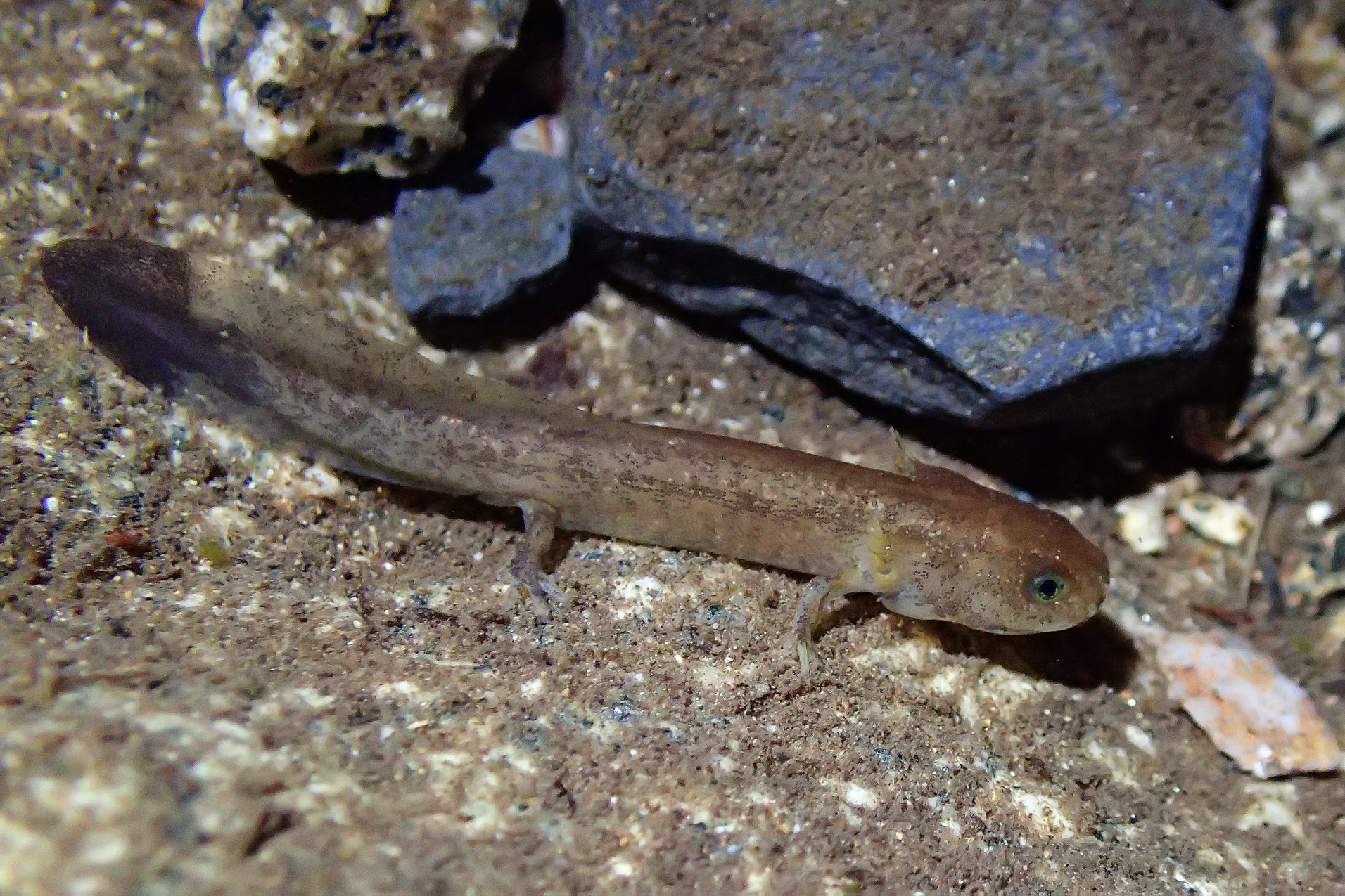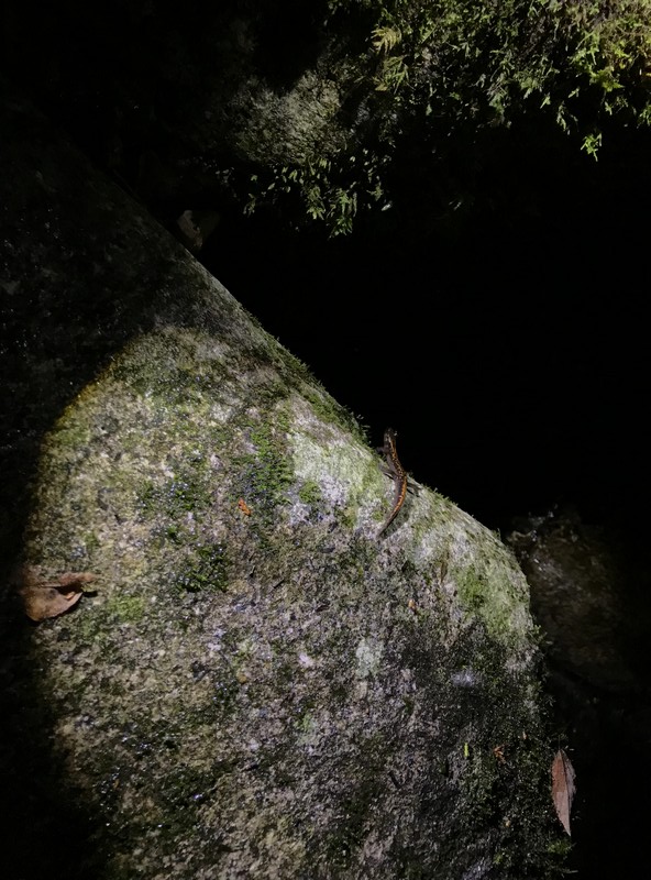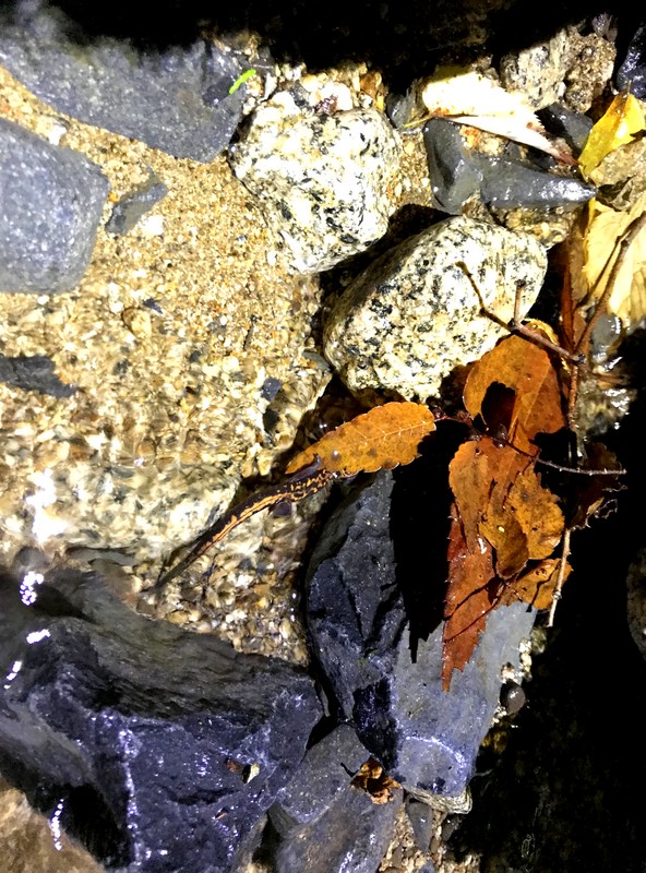 開始30分ほどでヒダサンショウウオの幼生が石の上に佇んでいるのを発見。