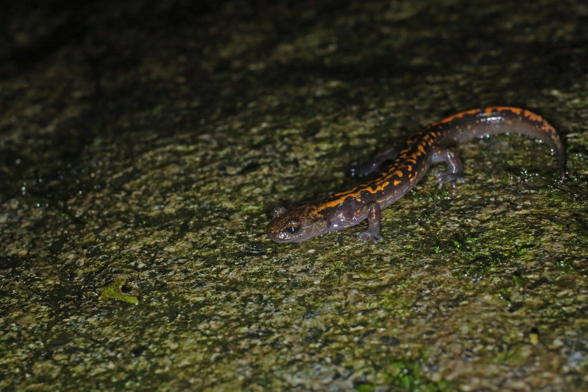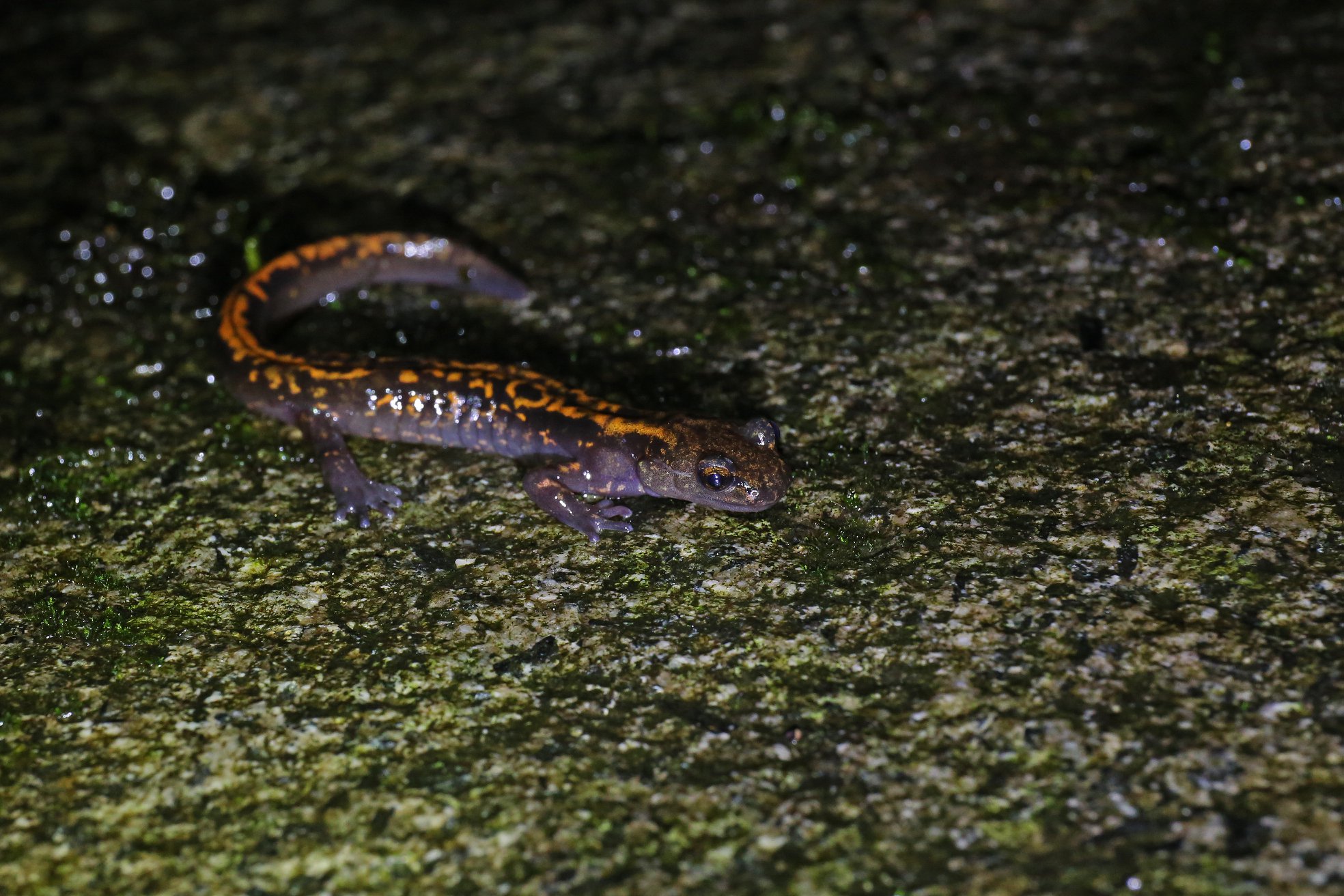 沢の端の岩に張り付くハコネサンショウウオを発見!