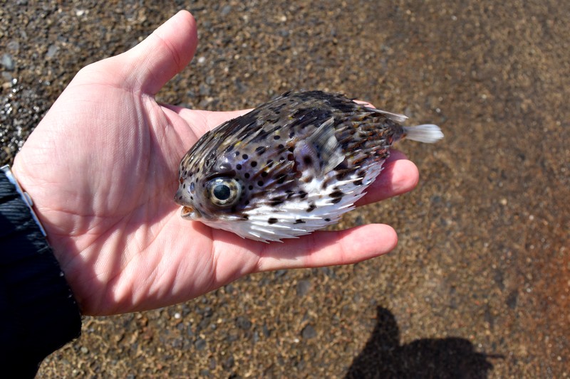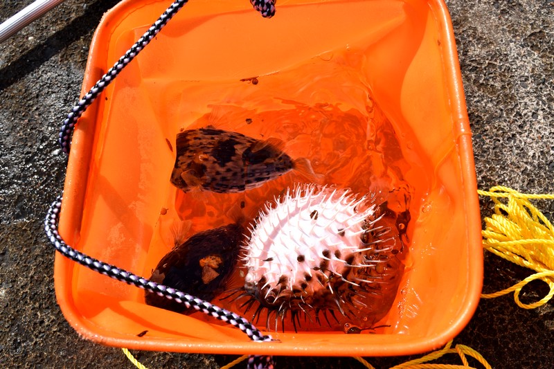 急いで車に網を取りに帰り、ハリセンボン掬いに挑戦する。