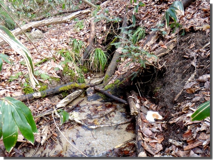 近くのコンビニに急行するため車に戻る道中、今にも枯れそうな沢が目に入る。