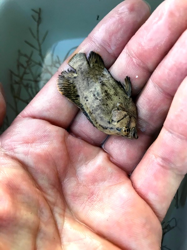 掬い損ねた藻の際に茶色い平たい魚が。