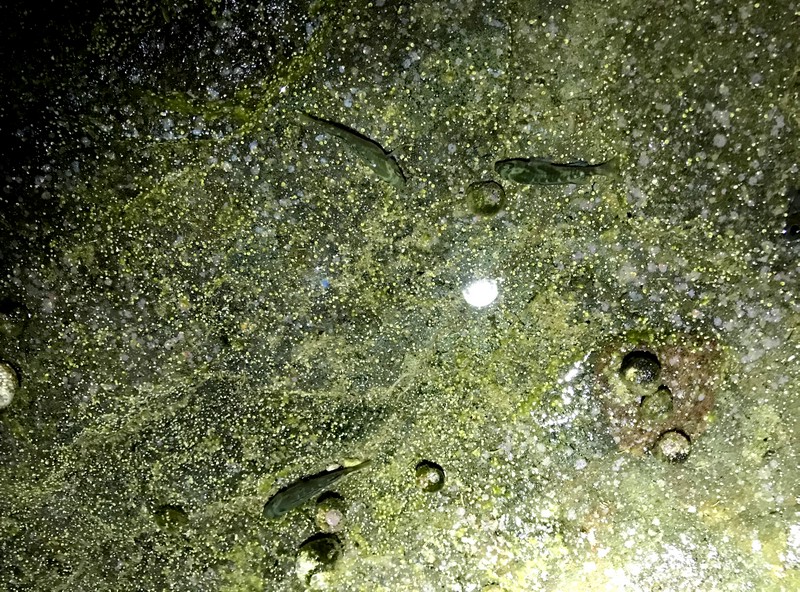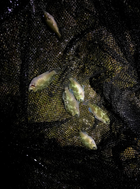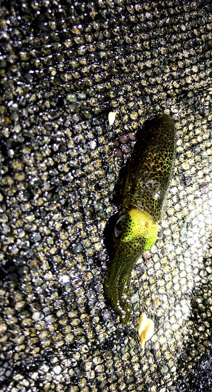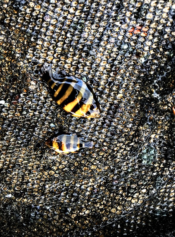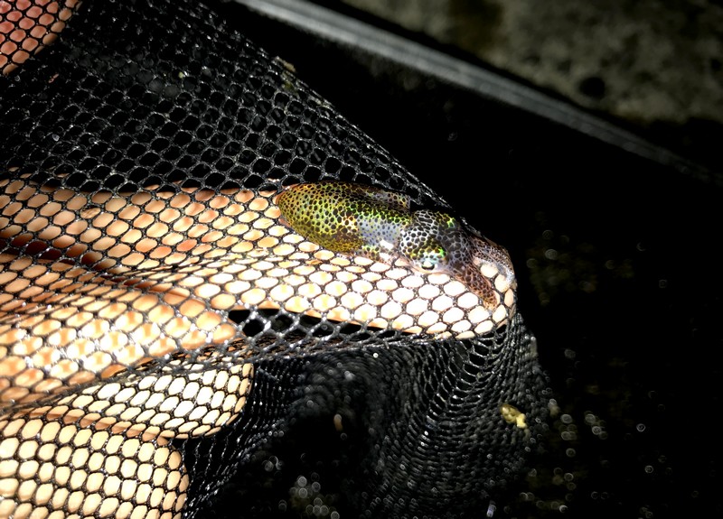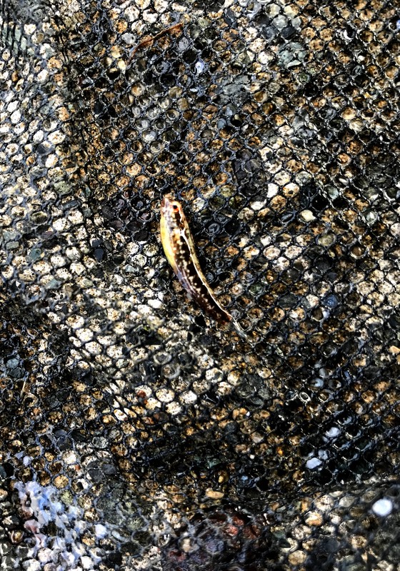 ロープ際、流れ藻付近を網でワシワシやると小さな魚が登場。